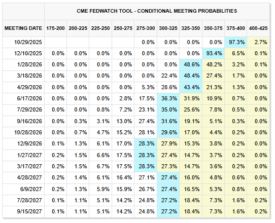 市场已经完全消化了FOMC在10月28-29日会议上降息25个基点的预期。芝商所的FedWatch工具显示exness官网中文app下载,,美联储将目标利率下调至3.75%至4.00%区间的概率高达97%以上。