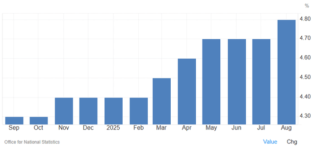 英国国家统计局(ONS)的数据显示,失业率已攀升至四年来的高点4.8%。