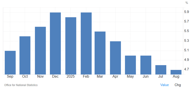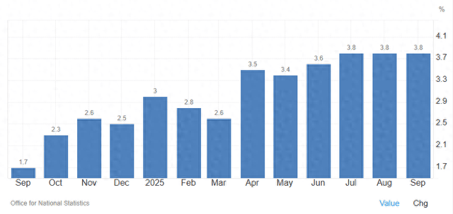 于10月22日发布的英国2025年9月消费者价格指数(CPI)数据显示,年度通胀率出人意料地维持在3.8%的水平,与市场普遍预期的4.0%相悖。这似乎是个积极信号,暗示通胀可能已在低于英国央行(BoE)预期的水平见顶。这已是该数据连续第三个月保持在同一水平,也是自2024年1月以来的最高联合记录。