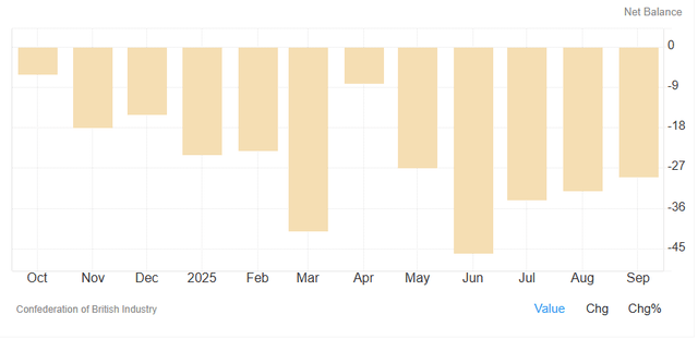 首先,来自英国工业联合会(CBI)的9月份分销贸易调查报告显示,零售销量已连续第十二个月下滑。销售差额为-29%,且零售商预计10月份的下滑速度将进一步加快(预期为-36%)。作为备受推崇的领先指标,长达一年的持续萎缩表明零售业正深陷于持久的需求疲软之中。