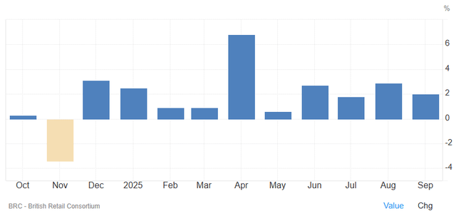 其次,英国零售商协会(BRC) 发布的零售销售监测报告也印证了这一趋势。9月份的年度零售销售额增长率从8月份的2.9%减速至2%。