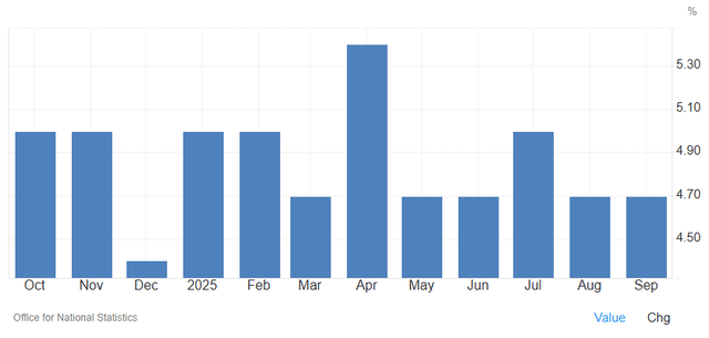 对于英国央行而言,最具决定性意义的数据点是服务业CPI通胀率。该指标在9月份依然顽固地维持在4.7%的高位,与上月持平。服务业通胀被央行视为衡量本土通胀压力的更佳指标,因为它主要由国内薪资增长驱动,受全球大宗商品价格波动的影响较小。尽管劳动力市场已出现降温迹象,但该数据未能如期回落,这无疑是一个重大的隐忧。